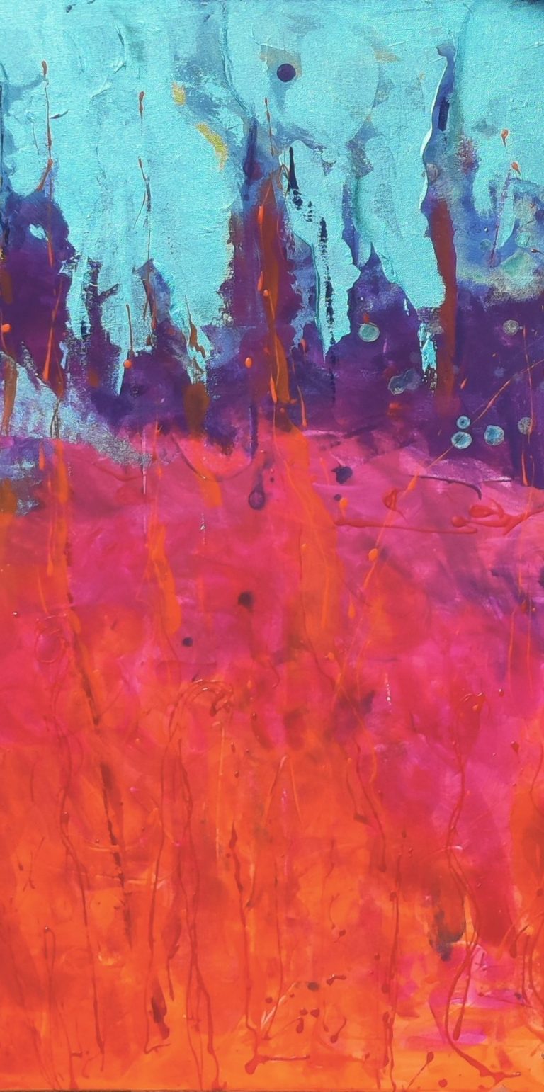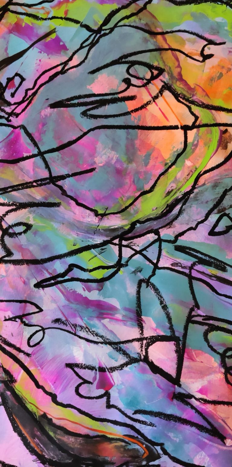 Sehr bunt, sehr weiblich, sehr ausdrucksstark, abstrakt, expressionistisch.